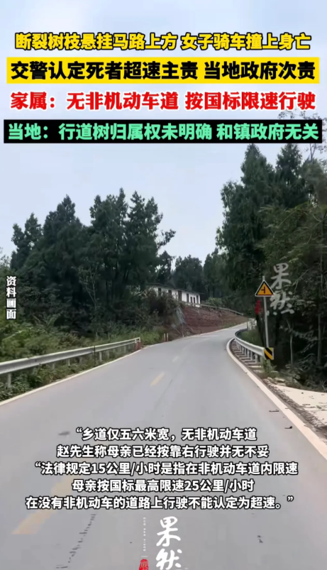 陕西兴平,5旬大妈戴着头盔骑电动车回家时,因撞上悬挂马路上方的断裂树枝导致当场死亡。事后交警认定大妈时速超过15公里属于超速行驶应承担主要责任、道路两旁树木的管理者镇政府承担次要责任。但家属和镇政府都不认可并申请复议。