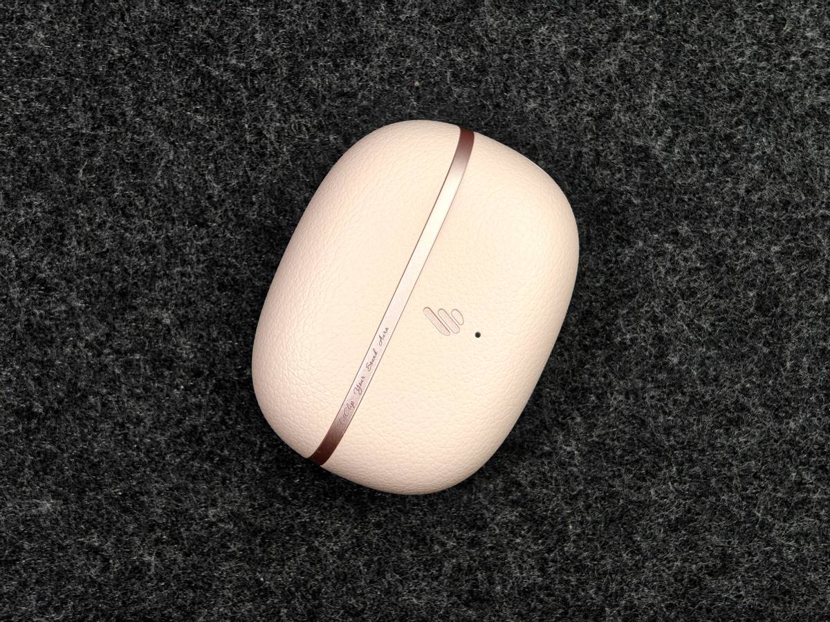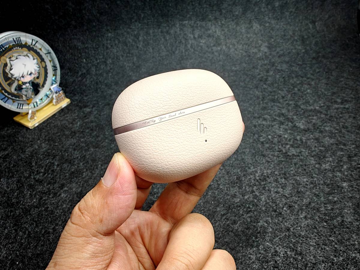 打开盒子,椭圆形的耳机仓映入眼帘,拿在手里的感觉像是一枚鹅卵石,小巧轻灵,金色的腰线和漫步者的logo是点睛之笔,高级感十足,外壳的荔枝纹设计不仅视觉上更好看,还能让耳机仓更加耐磨,非常实用的设计。