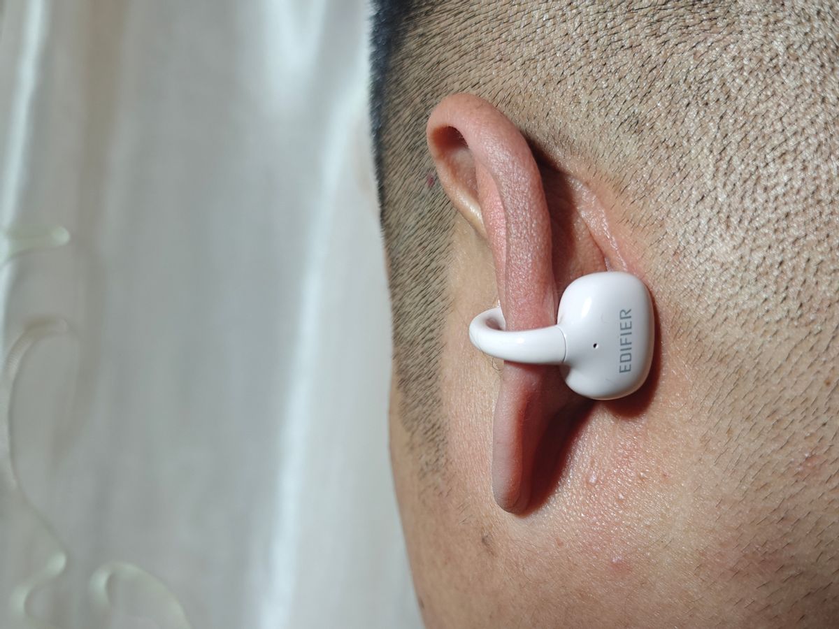 耳机采用如今流行的夹耳式设计,非常小巧,使用了多曲率人体工学设计,加入了0.5mm的柔韧镍钛合金丝,单耳重量仅为5.4g,实际佩戴体验中我感觉轻如无物,没有什么不适感,相比半入耳式耳机容易带来的耳涨,耳朵痒等问题,我在戴漫步者FitClip Ultra的过程中,没有遇到过。期间我也曾骑自行车,跑步等等,耳机始终是稳稳的在耳朵上,表面采用健康亲肤涂层,就算是我运动出汗也没感觉到不适,真正的做到了无感佩戴。