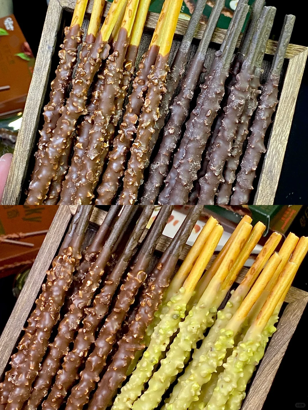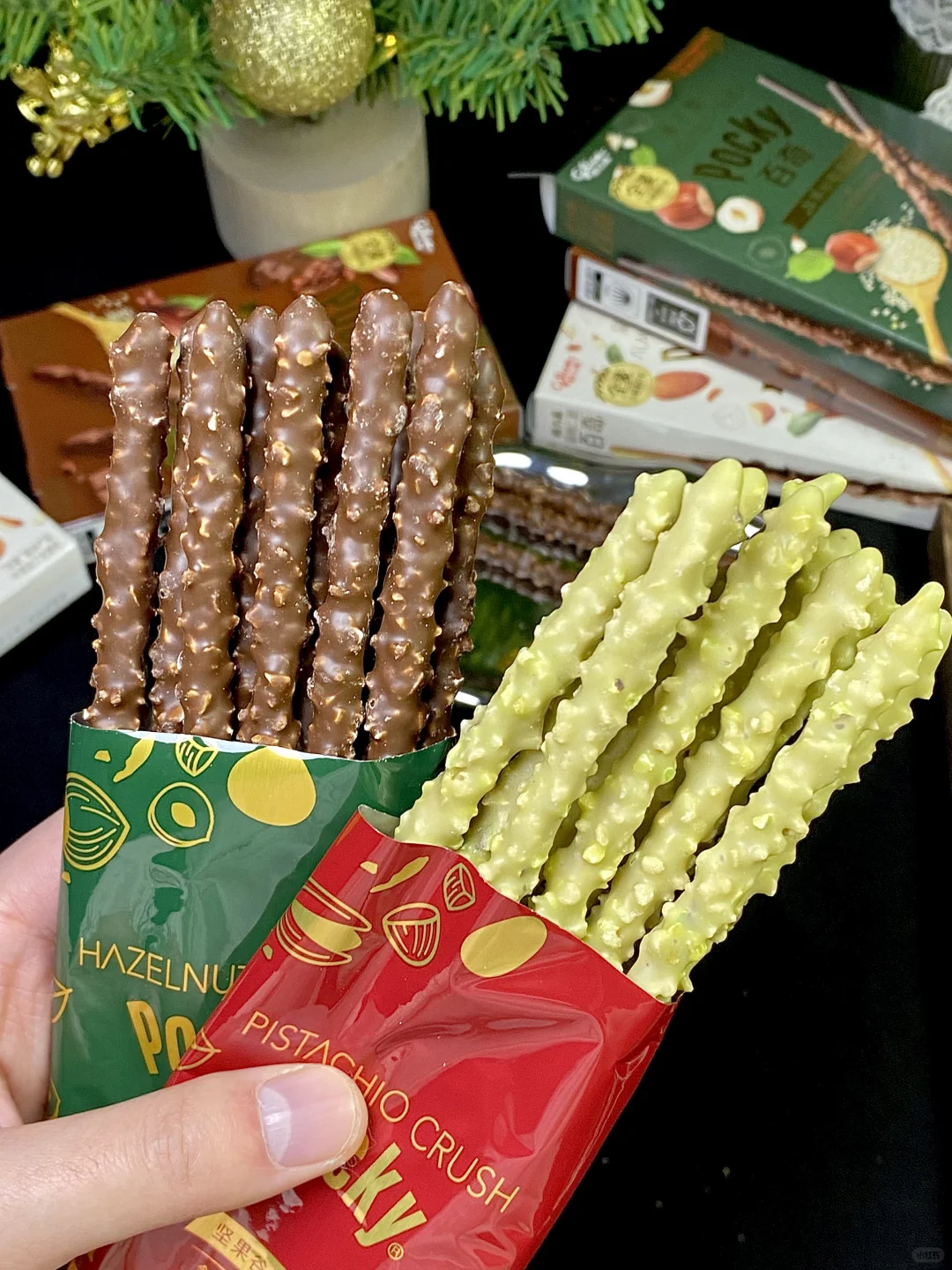 榛子脆百奇,榛子的醇厚与巧克力的丝滑相融合,每一口都能感受到榛子的坚果香与巧克力的浓郁香气,每一粒坚果碎在齿间咔嚓作响。