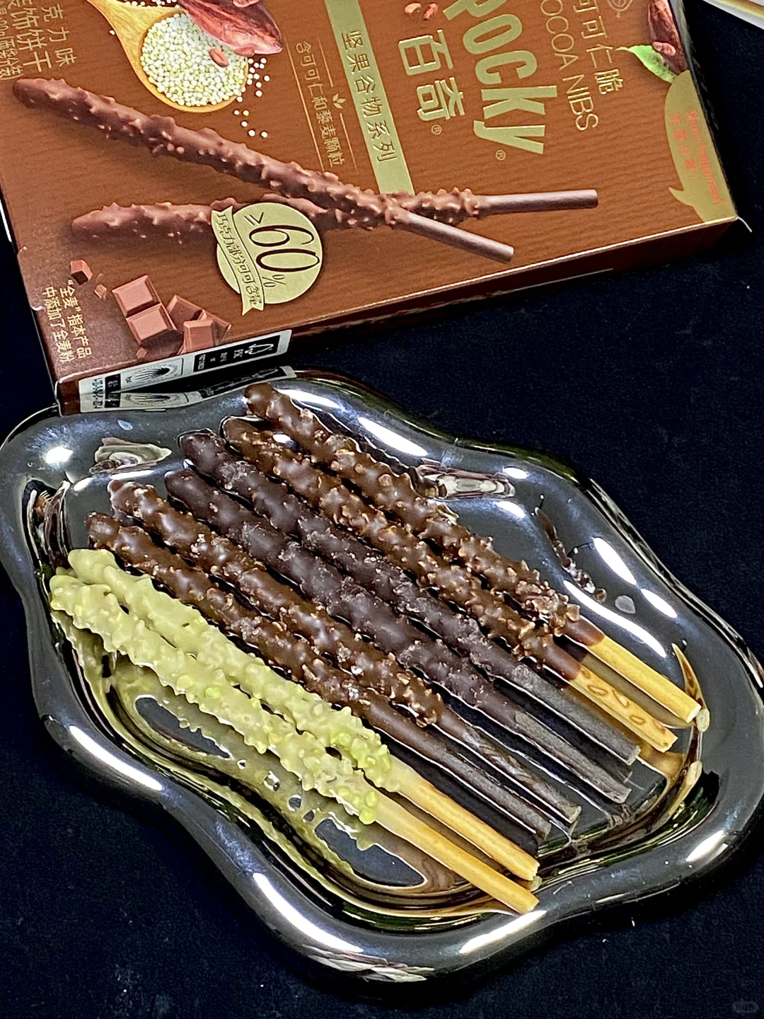 可可仁脆百奇,巧克力部分可可含量高达 60%,黑巧爱好者很难不爱。每一根饼干棒都被厚厚的巧克力涂层紧紧包裹,涂层上更是点缀着可可仁颗粒与饱满的藜麦颗粒,口感丰富,层次分明~