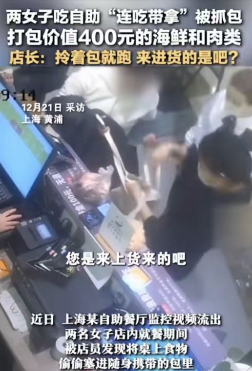 上海,两名女子去吃自助餐,竟然偷偷将400多元菜品装进了随身携带的包中,店员发现后气得连连吐槽:海鲜和肉装了满满两大包,这不是来吃饭,是来进货的吧!