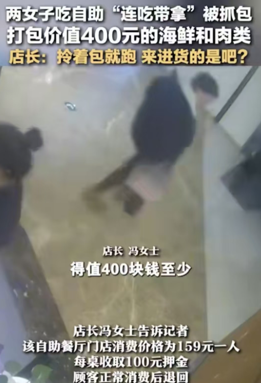 自助餐厅的菜品不能外带,这是大家都知道的事情。两名女子不仅在店里吃,还趁人不备偷偷装进包里准备带走。