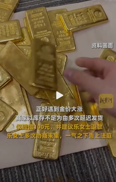 北京,女子为了投资,以478元每克的价钱,分批网购了2300克金条,总共花了110万左右。女子下单后金价大涨,她天天盼着快点拿到金条,没想到,商家竟以库存不足为由,一直拖着不发货,眼看拖不下去了,竟让女子申请退款,还说可以赔偿她100元。女子气坏了,觉得商家就是看金价涨了,反悔了,故意不发货的,这不是欺骗消费者吗?多次协商未果后,女子把商家告上法庭,法院判了!