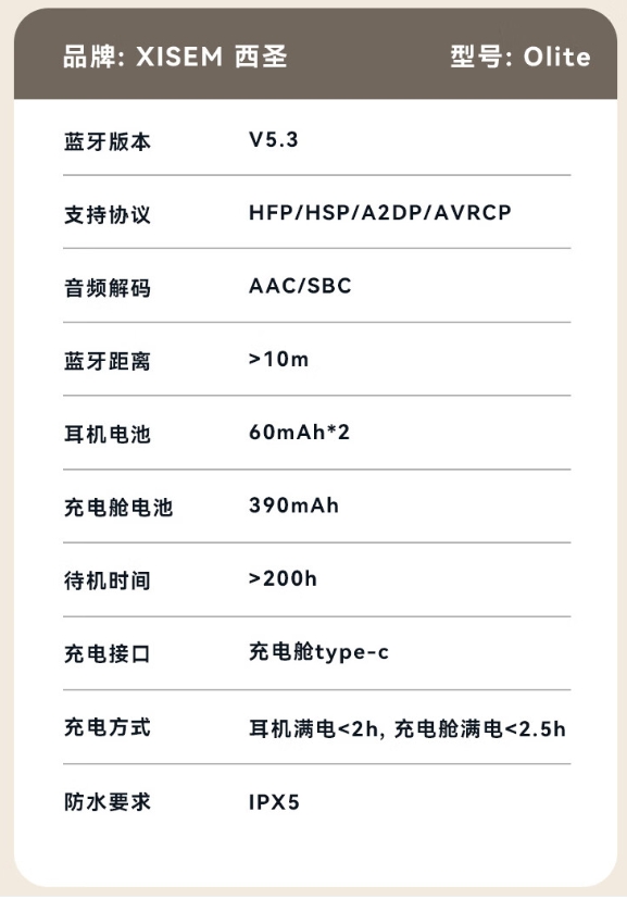 西圣Olite搭配的是蓝牙5.3芯片,在这个价位是无敌的性价比,具有更强的抗干扰能力和更稳定的连接性能。无论是在拥挤的城市街道还是信号较差的山区里使用时都能够保持稳定的连接不断线播放带来畅享音乐的同时使用简单便捷容易上手。同时它还支AAC/SBC/APTX等高清音频解码格式让音质更加接近无损音质。