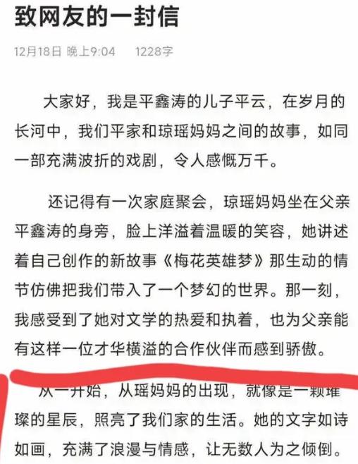 琼瑶离世半个月,平云发布了喊妈妈的道歉信。 这声妈妈晚了一点!如果在琼瑶阿姨生前的时候有所行动,相信她的遗憾会少很多,而他们也好很多。 急了,舆论风向不利,开始公关了,毕竟没有版权,现在的出版社早已江河日下,纸媒时代已成历史。 说明一个问题爱情是不可靠的,爱自己才是最真实的人生几十年,何必纠结于爱情,最后伤害的是自己。