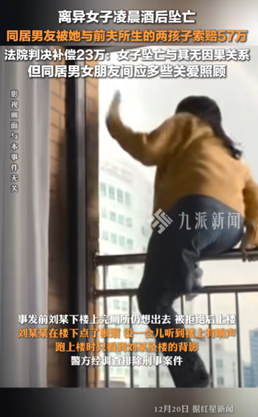 (来源:极目新闻2024年12月21日关于《离异女子凌晨酒后坠亡,同居男友被判补偿逝者两孩子23万元》的报道)