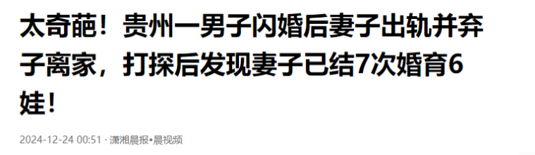 (信息来源: 潇湘晨报 2024年12月24日 《离谱!贵州一男子闪婚生女后妻子跑了,还发现她结过7次婚有6个娃》)