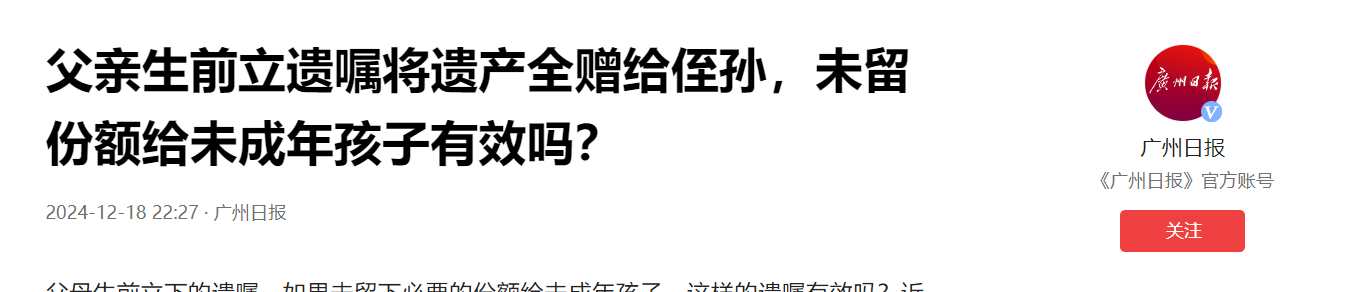 (信息来源:广州日报 2024年12月18日 《父亲生前立遗嘱将遗产全赠给侄孙,未留份额给未成年孩子有效吗?》)