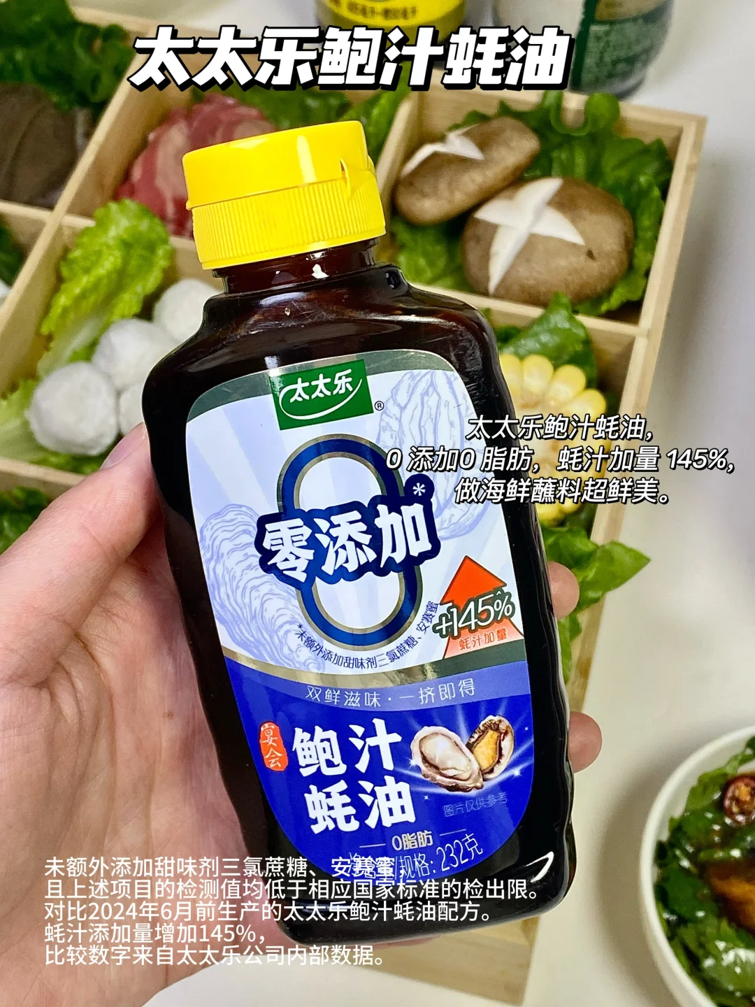 这个蘸料的灵魂就是要用太太乐鲍汁蚝油,可以看到蚝汁提到了配料表第一位,升级后蚝汁加量+145%,一开盖就是非常浓郁的大海的气息~做海鲜蘸料超鲜美。而且还是0添加0脂肪,管理期的姐妹放开了吃!