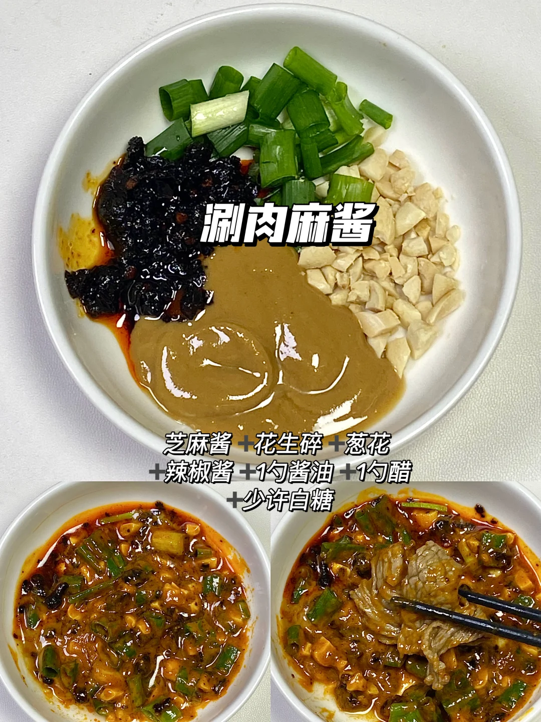 芝麻酱 ➕花生碎➕葱花➕辣椒酱 ➕1勺酱油 ➕1勺醋➕少许白糖