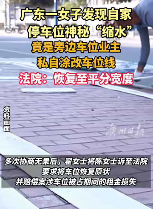 (信息来源:广州日报2024年12月24日关于《广东一女子发现自家停车位神秘“缩水”竟是旁边车位业主私自涂改车位线 法院:恢复至平分宽度》的报道