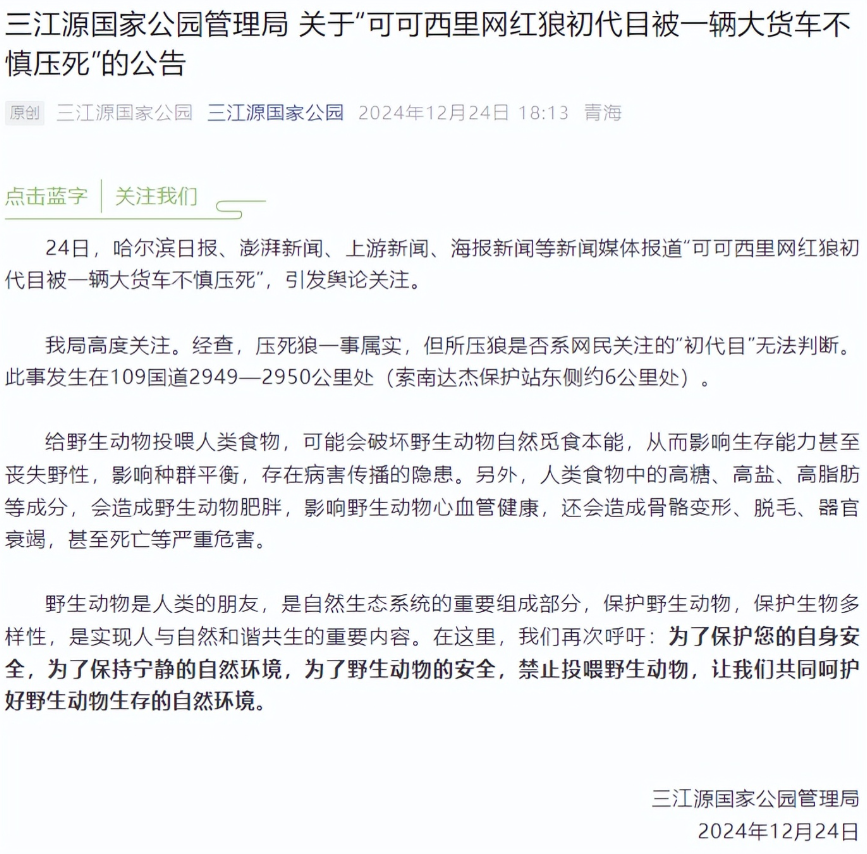(信源:2024-12-25 ·光明网关于《担心的事发生了!“网红狼”被货车压死?官方通报》的报道)
