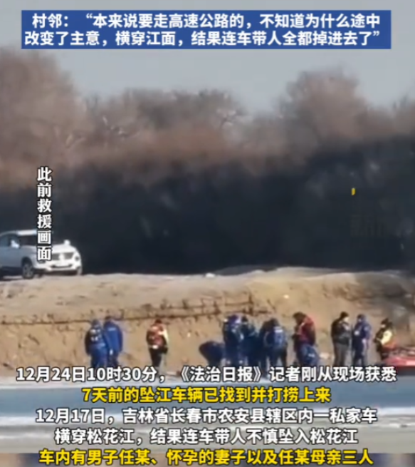 12月24日,一起令人痛心的悲剧在吉林松花江上发生。任某(化名)一家三口在驾车过江时,冰面突然破裂,车辆连同人员一同坠入江中。经过救援队的全力搜寻,七天后,坠江车辆终于被打捞上来,但一家三口的安危仍牵动着众人的心。