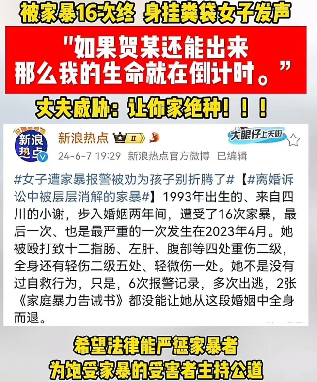 更令人愤怒的是,贺某的妹妹对此事的态度。她不仅不劝告哥哥,反而说出“打是亲骂是爱”的荒谬言论,简直令人三观尽毁。这种对家暴的纵容和误解,不仅是对谢女士的二次伤害,更是对广大女性同胞的侮辱。