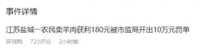 信息来源:2024-12-25 ·极目新闻《江苏盐城一农民卖羊肉获利180元被市监局开出10万元罚单》