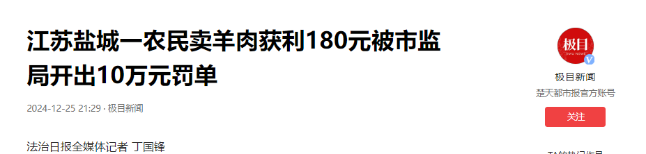 信源:2024-12-25 ·极目新闻《江苏盐城一农民卖羊肉获利180元被市监局开出10万元罚单》