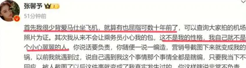 张馨予开撕了!回应空姐爆料其架子大。 空姐放一下包而已,不是本职工作么? 别说是名牌包了,就是个塑料口袋有人叮嘱你小心点也没问题吧? 头等舱给人家放个包不很正常吗?人家让小心点没错吧! 不管是不是明星,吐槽人家真没必要,只能说当空乘觉得不合格,做人也是个碎嘴。