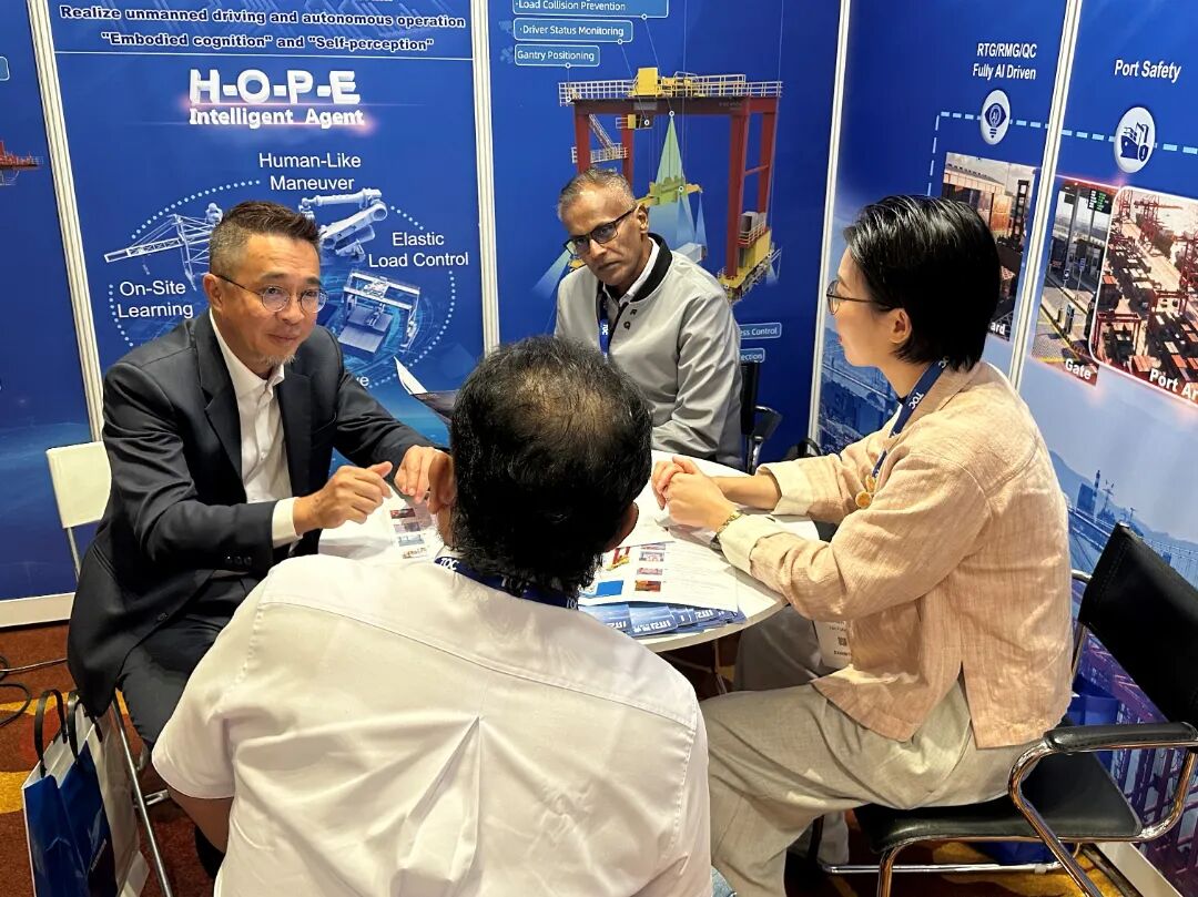 此外,海睿未来团队在展会期间与包括振华重工、三一重工在内的国内主机厂,以及DP World、APMT等国际码头运营商和多位东南亚码头业主,分别探讨了技术融合与落地路径,洽谈潜在的业务合作。