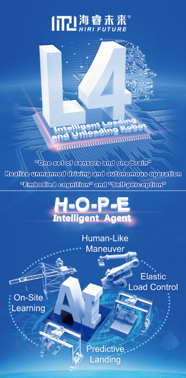 本次展出的核心亮点之一,是集团旗下品牌“海睿未来”基于自研的 **HIRI港口基座大模型所打造的“ L4智能装卸机器人”**系统。该系统通过 “一套传感,一个大脑” 的颠覆性集成设计,首次为港口大型设备赋予 “具身认知” 与 “自我感知” 能力。