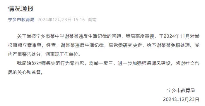 处理结果:宁乡市教育局高度重视,经调查核实后,对谢某作出免职处理、严重警告处分,并调离现工作单位.