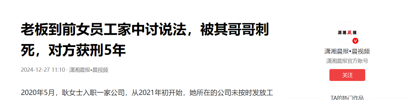 (信息来源:潇湘晨报 2024年12月27日 《老板到前女员工家中讨说法,被其哥哥刺死,对方获刑5年》)