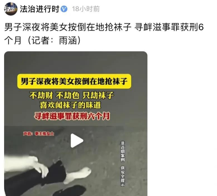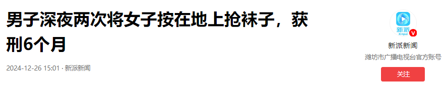 (信源:2024-12-26 ·新派新闻《男子深夜两次将女子按在地上抢袜子,获刑6个月》、法治进行时)
