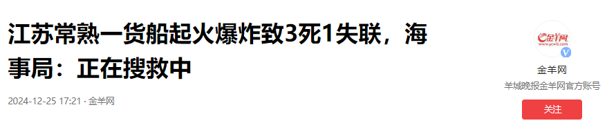 信源:·金羊网 2024-12-25 《江苏常熟一货船起火爆炸致3死1失联,海事局:正在搜救中》