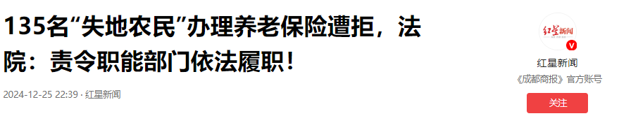 信源:2024-12-25 ·红星新闻《135名“失地农民”办理养老保险遭拒,法院:责令职能部门依法履职!》
