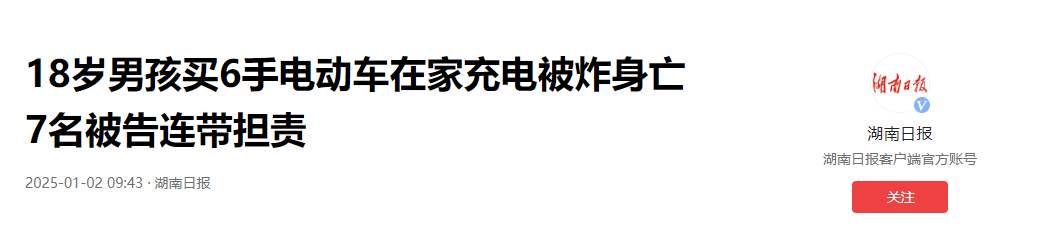 信源:湖南日报 2025年1月2日 《18岁男孩买6手电动车在家充电被炸身亡 7名被告连带担责》