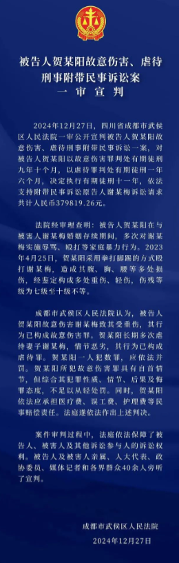 “我只是用手轻轻拍了他,他就照死打我!”2024年12月27日,四川省成都市武侯区人民法院对贺某故意伤害及虐待案进行了一审公开宣判,贺某被判有期徒刑11年。这起案件的背后,是一段令人痛心的婚姻悲剧。