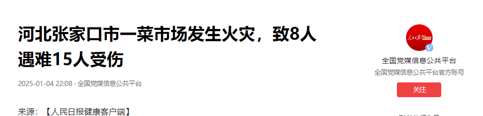 1月4日,河北省张家口市桥西区一菜市场突发大火,造成8人死亡,15人受伤,这一惨痛消息迅速传遍网络,牵动了无数人的心。据官方通报,火灾发生在早上8点40分左右,消防、应急、医疗等部门第一时间赶赴现场,经过紧张救援,10点10分明火被扑灭,12点50分现场救援工作结束。