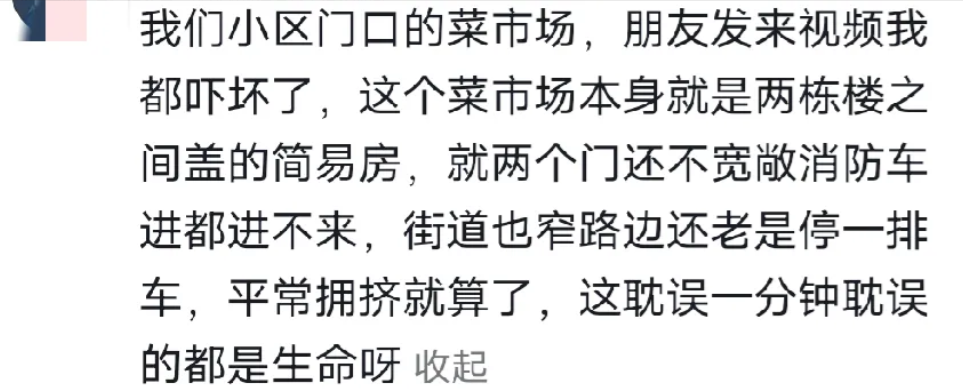 更令人揪心的是,有网友指出,该菜市场是一个搭在两栋楼之间的简易房子,东门和西门都不宽敞,消防车难以进入,且外边路况不佳,道路偏窄还经常停满车辆,这无疑给救援工作带来了极大困难。火灾发生时,每一分每一秒都至关重要,任何延误都可能造成无法挽回的损失。
