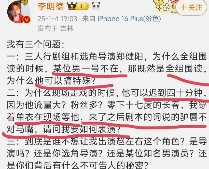 李明德好样的,凭一己之力揭露娱乐圈,这小伙子就争一个事情,作为演员必须背台词,围读剧本,不管什么人,多大的牌子的演员,都应该敬业。 挺喜欢马天宇,但这事我支持李明德,马天宇要好好努力呀! 支持爆料吧,内娱现在确实以流量当道,层层无穷的出流量明星,小鲜肉,也难怪上了年纪的女明星不服老还要强装嫩,都是怕被淘汰。 多多出像易烊千玺这样年轻人,努力上进的年轻一辈!