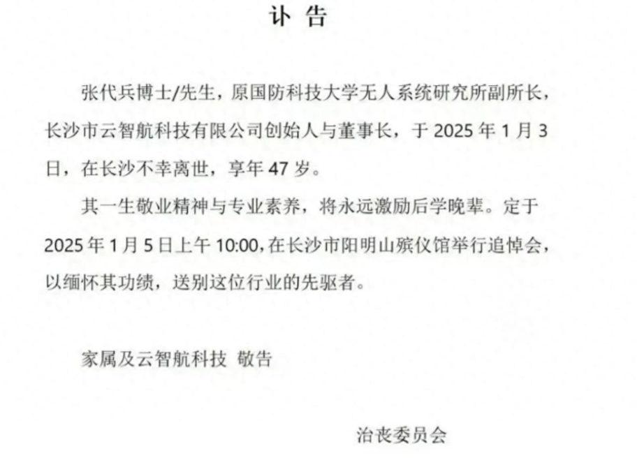 痛惜!惋惜!2025年1月3日,我国无人机领域的重要专家,国防科技大学张代兵博士,在长沙不幸离世,年仅47岁。这一消息令人痛心,也引发了社会对科学家安保措施的广泛关注。