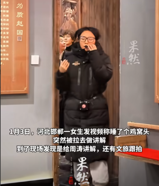 河北邯郸,“鸡窝头”女士回应了!2025年1月4日,河北邯郸一位临时被拉去景区做讲解的李女士(化名),因形象“潦草”却专业认真的表现意外走红网络。这位讲解员在被央视主持人周涛访问时,穿着大棉袄、顶着“鸡窝头”,与其他人员形成鲜明对比,却凭借全面的讲解获得了周涛及在场人员的肯定。