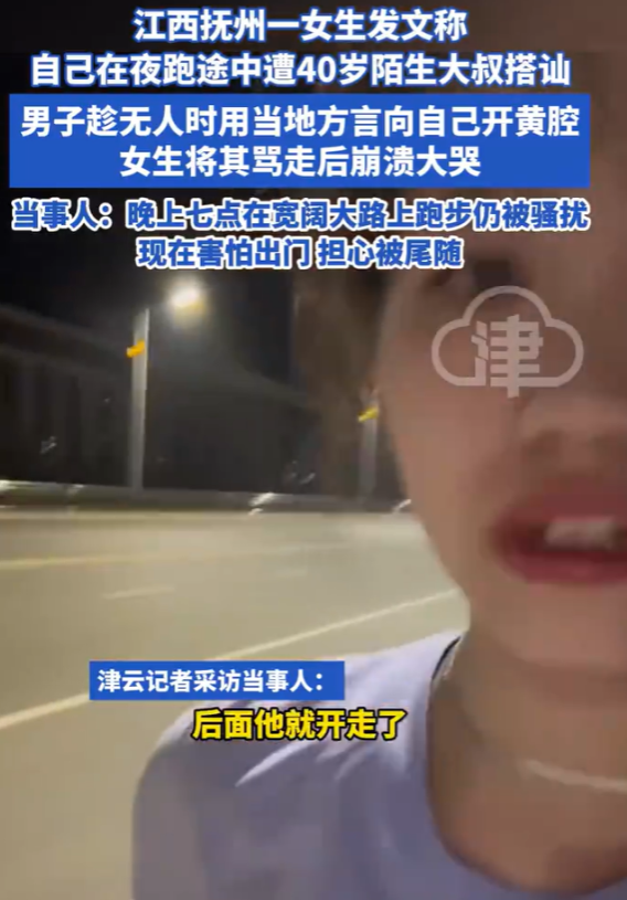 1月2日,江西抚州一女孩发文称,自己在夜跑时遭遇了一40多岁陌生男子的性骚扰。这男子起初搭讪没成功,走后又掉头回来问路,女孩一回应,他就用当地方言开起了黄腔。女孩气得把他骂走,然后崩溃大哭。她后来解释说,那男子的话实在太难听了,不是简单的约不约那种,我听了也觉得,那话任何一个女性都无法接受!