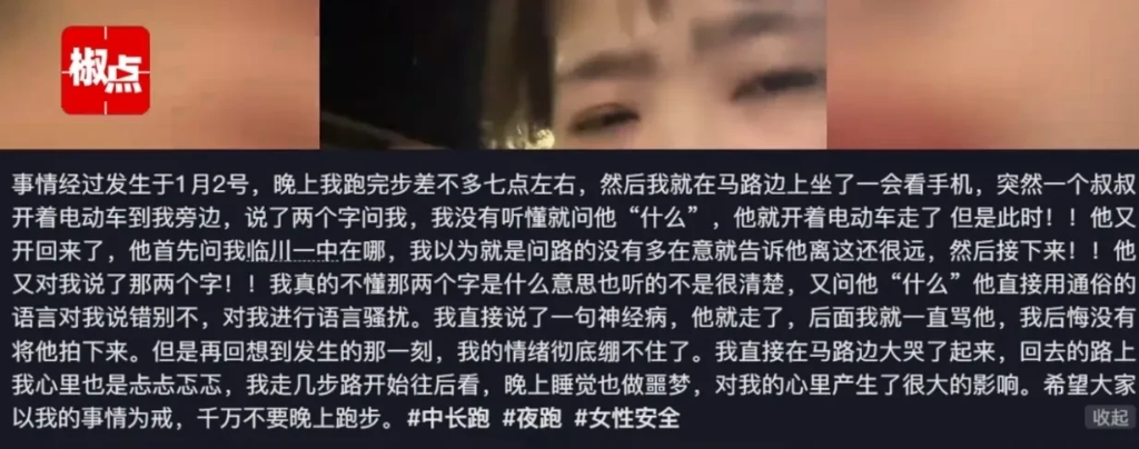 女孩夜跑遭性骚扰,发大哭视频却险遭网暴!