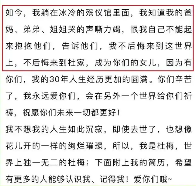 在自述的最后,杜梅表示不后悔来到这世界,不后悔成为杜家的女儿。网上能查询到的杜梅照片是其简历照,照片中的她面带微笑,阳光、青春、美丽,却凋零得太早。