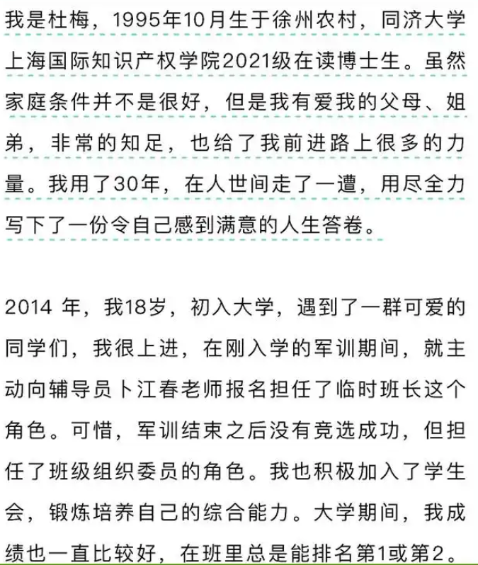 据杜梅自述,她1995年出生在江苏徐州的一个农村,2014年考入江苏科技大学人文社科学院,2017年获得上海大学研究生推免面试机会并成功就读,2020年研究生毕业后先进入国企工作,后辞去工作决定读博,进入同济大学上海国际知识产权学院攻读管理学博士学位。2023年底,她被公派到比利时鲁汶大学,2024年初抵达比利时后突发腰痛,检查结果不乐观,紧急回国治疗。