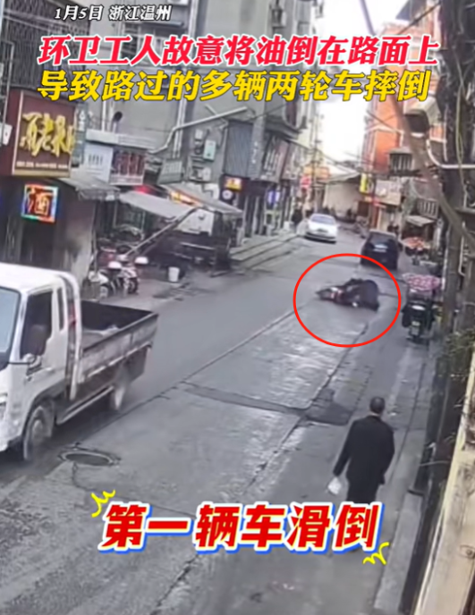 (信息来源:新闻夜班2025年1月7日关于《环卫工人故意将油倒在路面上,导致路过的多辆两轮车摔倒》的报道)