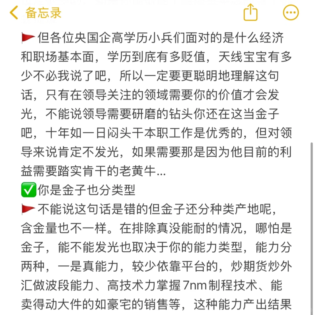🚩但各位央国企高学历小兵们面对的是什么经济和职场基本面,学历到底有多贬值,天线宝宝有多少不必我说了吧,所以一定要更聪明地理解这句话,只有在领导关注的领域需要你的价值才会发光,不能说领导需要研磨的钻头你还在这当金子吧,干好本职工作是基础(别耍滑)但得加别的,单这个对领导来说不发光,如果需要那是因为他目前的利益需要踏实肯干的老黄牛…