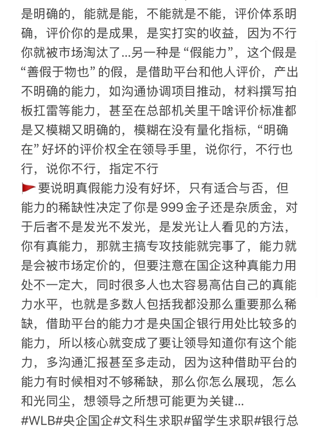 🚩要说明真假能力没有好坏,只有适合与否,但能力的稀缺性决定了你是999金子还是杂质金,对于后者不是发光不发光,是发光让人看见的方法,你有真能力,那就主搞专攻技能就完事了,能力就是会被市场定价的,但要注意在国企这种真能力用处不一定大,同时很多人也太容易高估自己的真能力水平,也就是多数人包括我都没那么重要那么稀缺,借助平台的能力才是央国企银行用处比较多的能力,所以核心就变成了要让领导知道你有这个能力,多沟通汇报甚至多走动,因为这种借助平台的能力有时候相对不够稀缺,你怎么展现,怎么和光同尘,想领导之所想可能更为关键…
