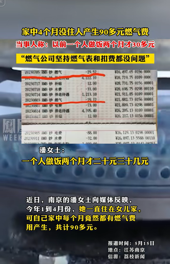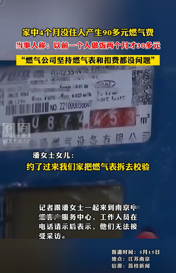 (信息来源:凤凰weekly关于《家中4个月没住人,产生90多元燃气费,当事人称:以前一个人做饭两个月才30多元,“燃气公司坚持燃气表和扣费都没问题”》的报道)