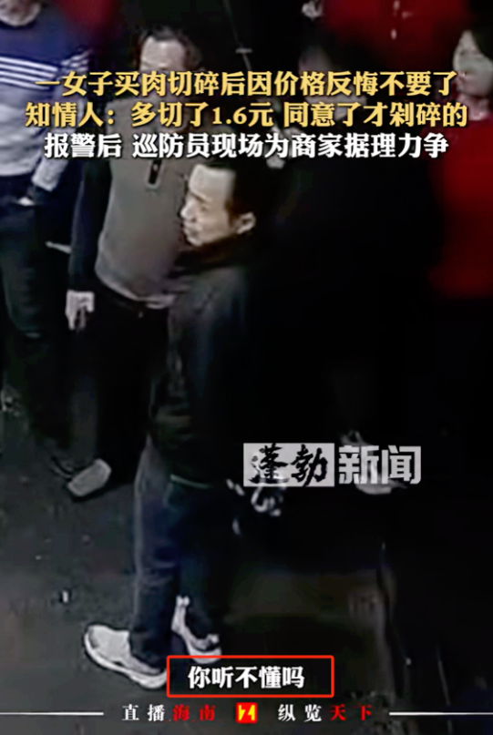 (信息来源:蓬勃新闻2025年1月7日关于《一女子买肉切碎后因价格反悔不要了,知情人:多切了1.6元,同意了才剁碎的,报警后,巡防员现场为商家据理力争》的报道)