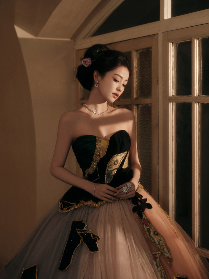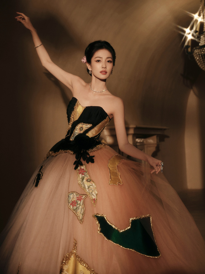 一袭Viktor & Rolf 高定礼服,层叠粉色纱裙,缎面刺绣拼接,发间别着花朵… 美钻珠宝点缀脖颈之间,变身华丽优雅的公主,温婉而浪漫~