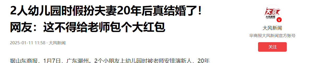 (信息来源:大风新闻 2025年1月11日 《2人幼儿园时假扮夫妻20年后真结婚了!网友:这不得给老师包个大红包》)