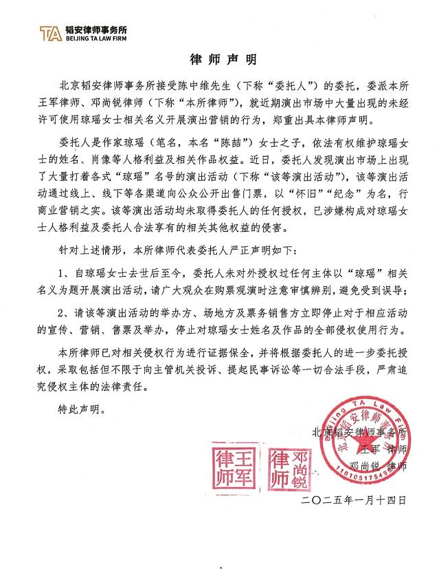 琼瑶离世后儿子陈中维发布律师声明,不忍母亲遭遇侵权行为! 支持家属坚定地维护
