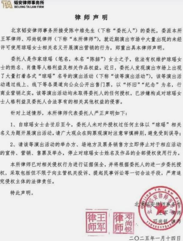 琼瑶儿子严陈中维委托律师发布声明,针对近期演出市场中大量出现的未经许可使用琼瑶相关名义开展的演出活动,明确表示这些活动均未获得任何授权。 可叹琼瑶阿姨,写了一辈子爱情小说,引领了多少人的爱情观,耄耋之年,却发现自己的爱情也逃不过现实中枕边人的算计。 琼瑶的名气是很大!但大的是什么呢?畅享爱情的伟大! 把年轻的,甚至年龄偏大的都把爱情看的神乎其神的。其实是扭曲了,爱情没有那么伟大。 对方有多爱你!男人有爱吗?