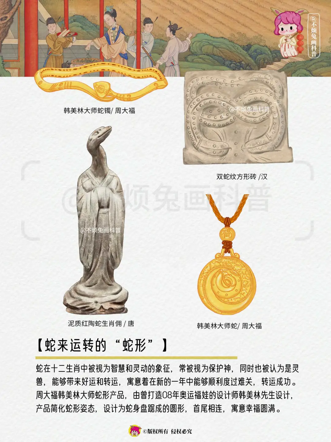 蛇在十二生肖中被视为智慧和灵动的象征,常被视为保护神,同时也被认为是灵兽,能够带来好运和转运,寓意着在新的一年中能够顺利度过难关,转运成功。周大福韩美林大师蛇形产品,由曾打造08年奥运福娃的设计师韩美林先生设计,产品简化蛇形姿态,设计为蛇身盘踞成的圆形,首尾相连,寓意幸福圆满。